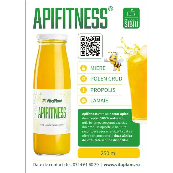 Apifitness este o bautura energizanta naturala si totodata un super aliment. Realizat dupa o reteta originala Dr.ing. Cornelia Dostetan Abalaru, Apifitness  ofera toate beneficiile nutritive ale produselor apicole din care este creat. Astfel, Apifitness este sursa naturala de proteine vegetale, aminoacizi esentiali, enzime de digestie, acizi grasi esentiali, vitamine, minerale esentiale, probiotice si prebiotice, oligoelemente si antioxidanti si este recomandat atat sportivilor cat si pesoanelor active interesate de o dieta sanatoasa. Consumat cu regularitate, Apifitness creste rezistenta la efort fizic si mental, reduce stresul oxidativ la nivel celuar, genereaza tesut muscular, regleaza apetitul, sustine digestia, stimuleaza procesele metabolice, sustine si protejeaza flora intestinala. Apifitness contine miere, polen crud, propolis, zeama de lamaie si apa plata.