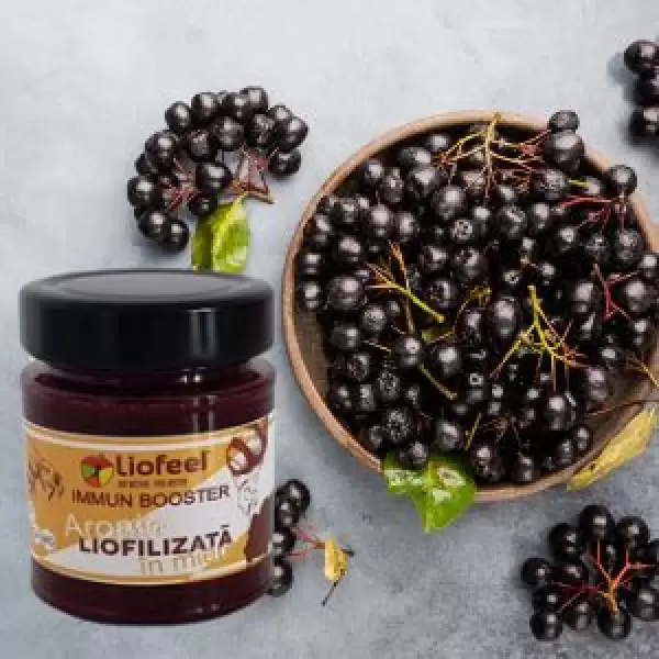 Immun Booster, realizate dupa retete originale Dr.ing. Cornelia Dostetan Abalaru, sunt amestecuri cremoase din miere naturala si fructe liofilizate. Mierea naturala, ingredient de baza in Immun Booster, nu este doar un indulcitor ci este si un antibiotic natural, un prebiotic – influenteaza positiv flora intestinala, un antiinflamator si un antiviral natural, un antioxidant puternic si un sustinator de nadejde al sistemului imunitar. Fructele liofilizate, adica deshidratate prin congelare rapida la temperaturi sub -50°C, pastreaza culoarea, textura, mirosul, gustul si valoarea nutritiva si terapeutica a fructului proaspat. Conform studiilor actuale, combinația dintre fructe liofilizate și miere are efecte deosebit de benefice asupra organismului. Deorece mierea naturala contine enzime de digestie, aceasta este digerata intr-un timp scurt in stomac, ajungand astfel, insotita de substantele active din fructele liofilizate, in sistemul sanguin si mai apoi in celulele corpului nostru. Sa luam spre exemplu, combinatia dintre miere naturala si aronia liofilizata. Substantele active din aronia raman intacte in urma liofilizarii. Ajungand in stomac impreuna cu mierea, care se digera repede, substantele active nu sunt distruse astfel de catre sucul gastric. Unele dintre cele mai importante substante active ale fructelor de aronia sunt fenoli antioxidanti, asa numitii flavonoizi. Acestia sunt antioxidanti foarte puternici care absorb radicalii liberi reducand astfel considerabil stresul oxidativ celular. Caracterul antioxidant al fructelor de aronia este sustinut si potentat de catre mierea naturala din amestecul Immun Booster. In acest fel, fenoli antioxidanti ajung intacti si repede in celulele organismului sustinand sistemul imunitar si prevenind astfel imbolnavirea.